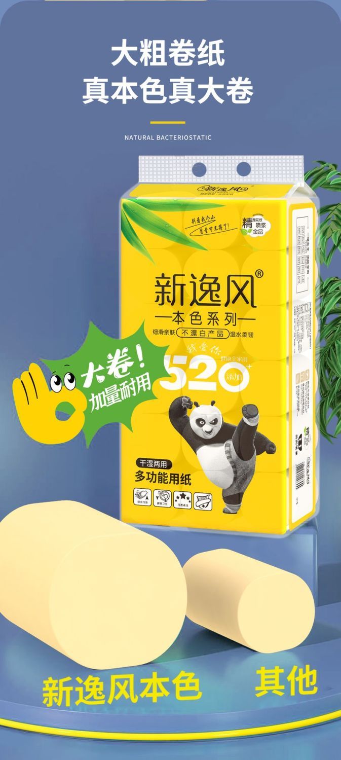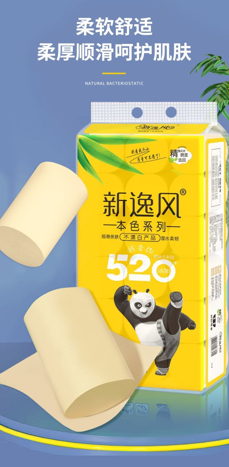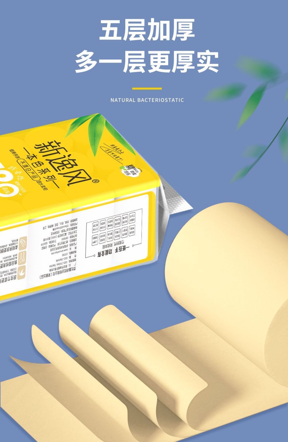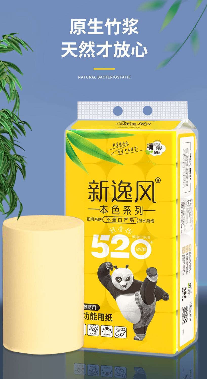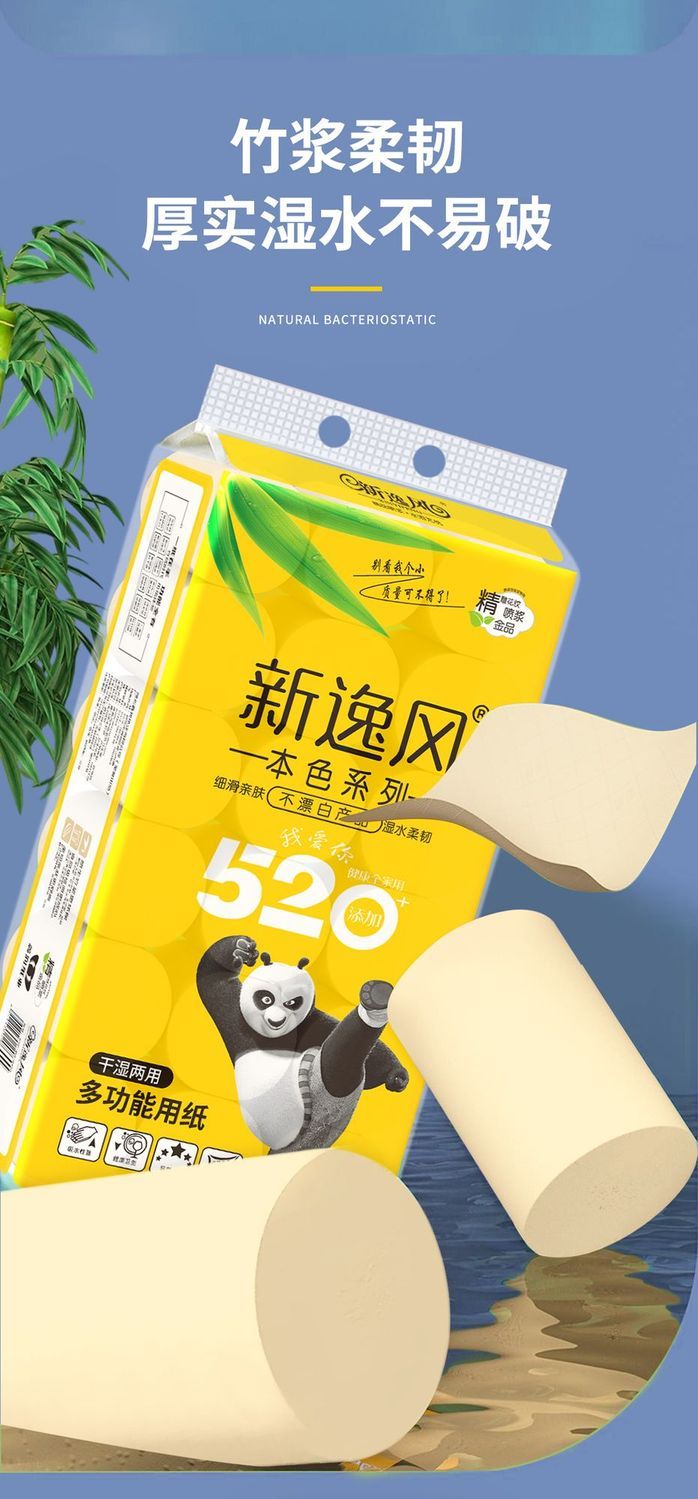 原生竹浆源自大自然的健康安全不添加全家共享安全最重要湿水不易破长纤维竹纸/湿水后仍柔韧/不易破自然原料 取材于竹浆本色五层加厚 柔韧性更好原竹纸浆 安全且健康 长竹纤维 柔软亲肤含竹醌成分 抑制细菌滋生采用天然的原生竹浆 健康环保无荧光剂甄选竹浆纸/本色不漂白/使用更放心母婴适用质感柔韧/舒适亲肤/更适合宝宝使用