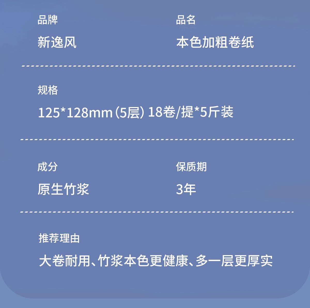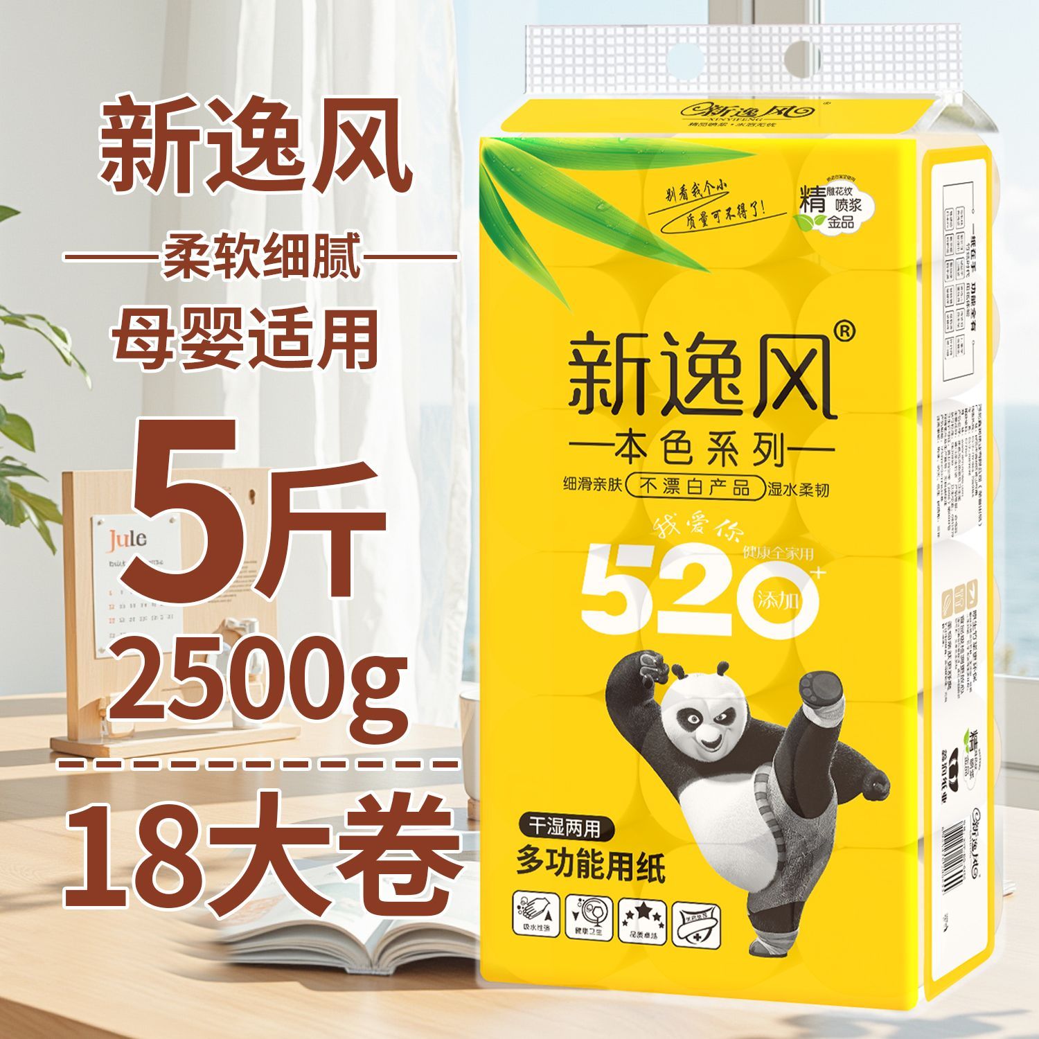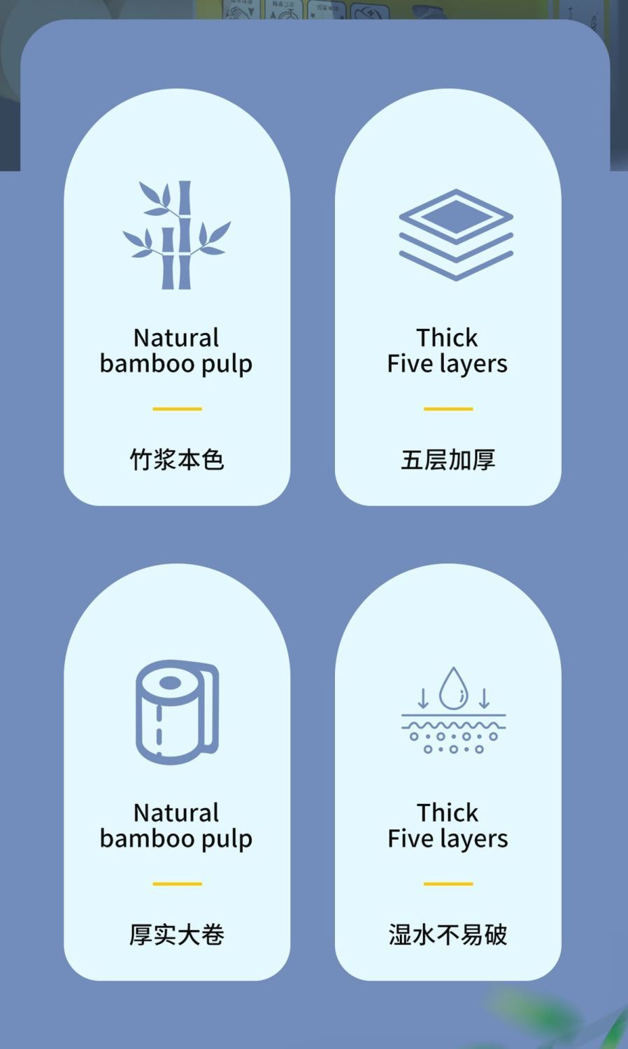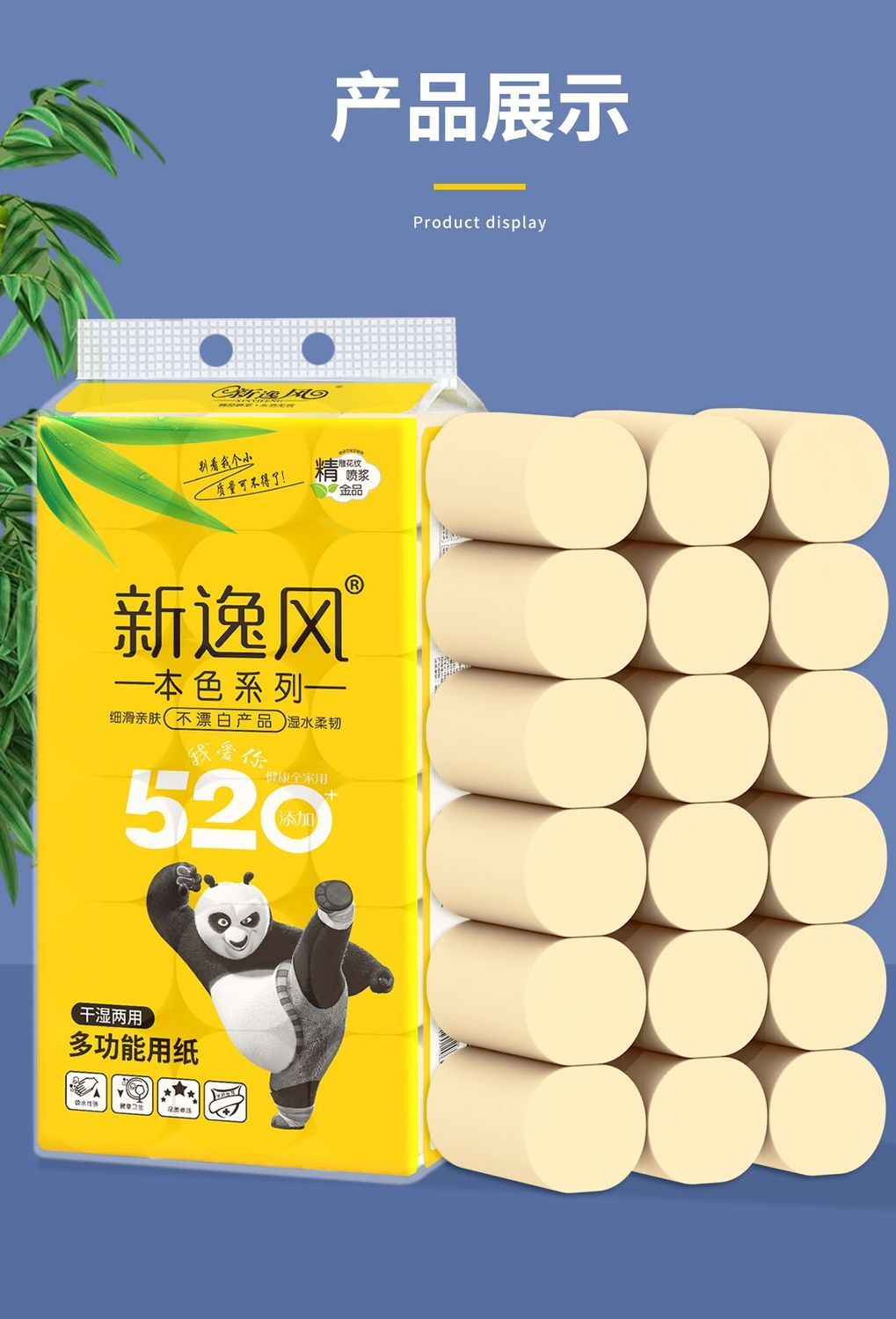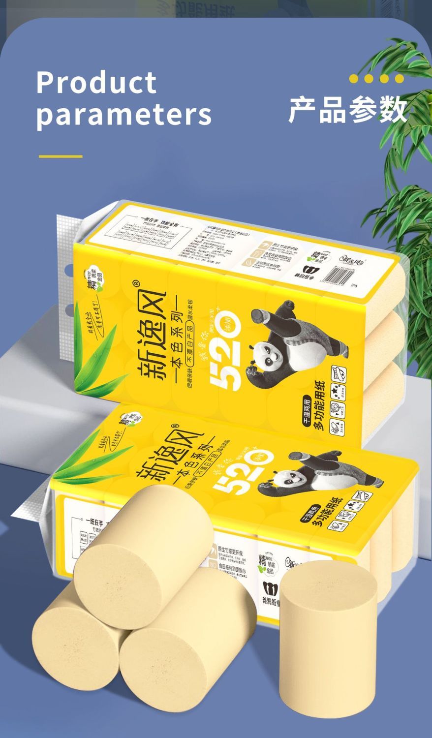 原生竹浆源自大自然的健康安全不添加全家共享安全最重要湿水不易破长纤维竹纸/湿水后仍柔韧/不易破自然原料 取材于竹浆本色五层加厚 柔韧性更好原竹纸浆 安全且健康 长竹纤维 柔软亲肤含竹醌成分 抑制细菌滋生采用天然的原生竹浆 健康环保无荧光剂甄选竹浆纸/本色不漂白/使用更放心母婴适用质感柔韧/舒适亲肤/更适合宝宝使用